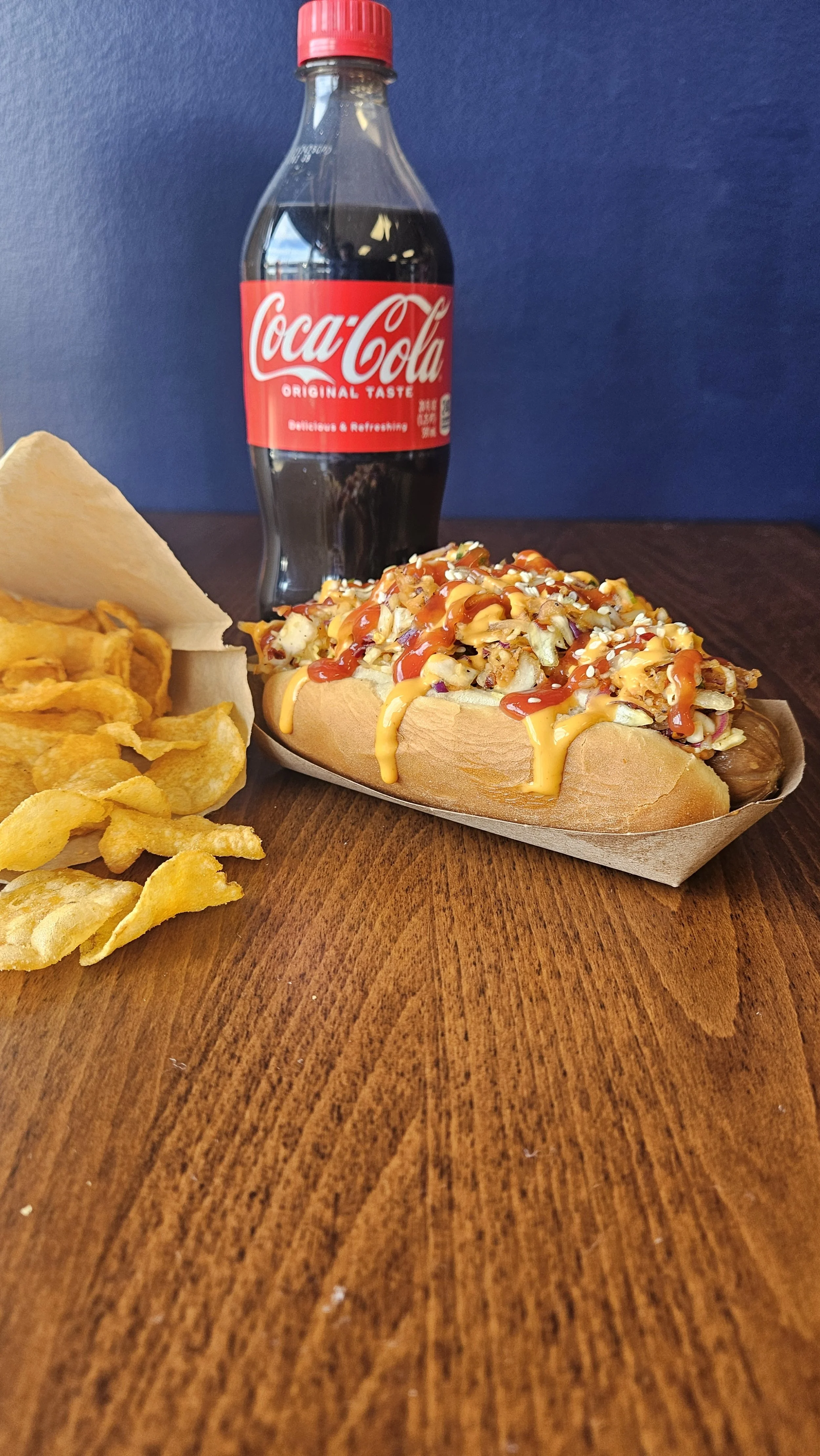 Craving sweet and spicy? We got you! This one will scratch that itch. We start with green and purple cabbage, fresh cut carrots, and onion. Then the magic happens: we toss the slaw in our house made Gochugaru, red-pepper sauce made with honey, crushed red pepper, garlic, soy sauce, sesame oil, rice wine vinegar, and sesame seeds. A healthy portion gets slathered on an all- beef, quarter-pound weiner and drizzled with Sriracha mayo and ketchup before we finish with a sprinkle of sesame seeds.